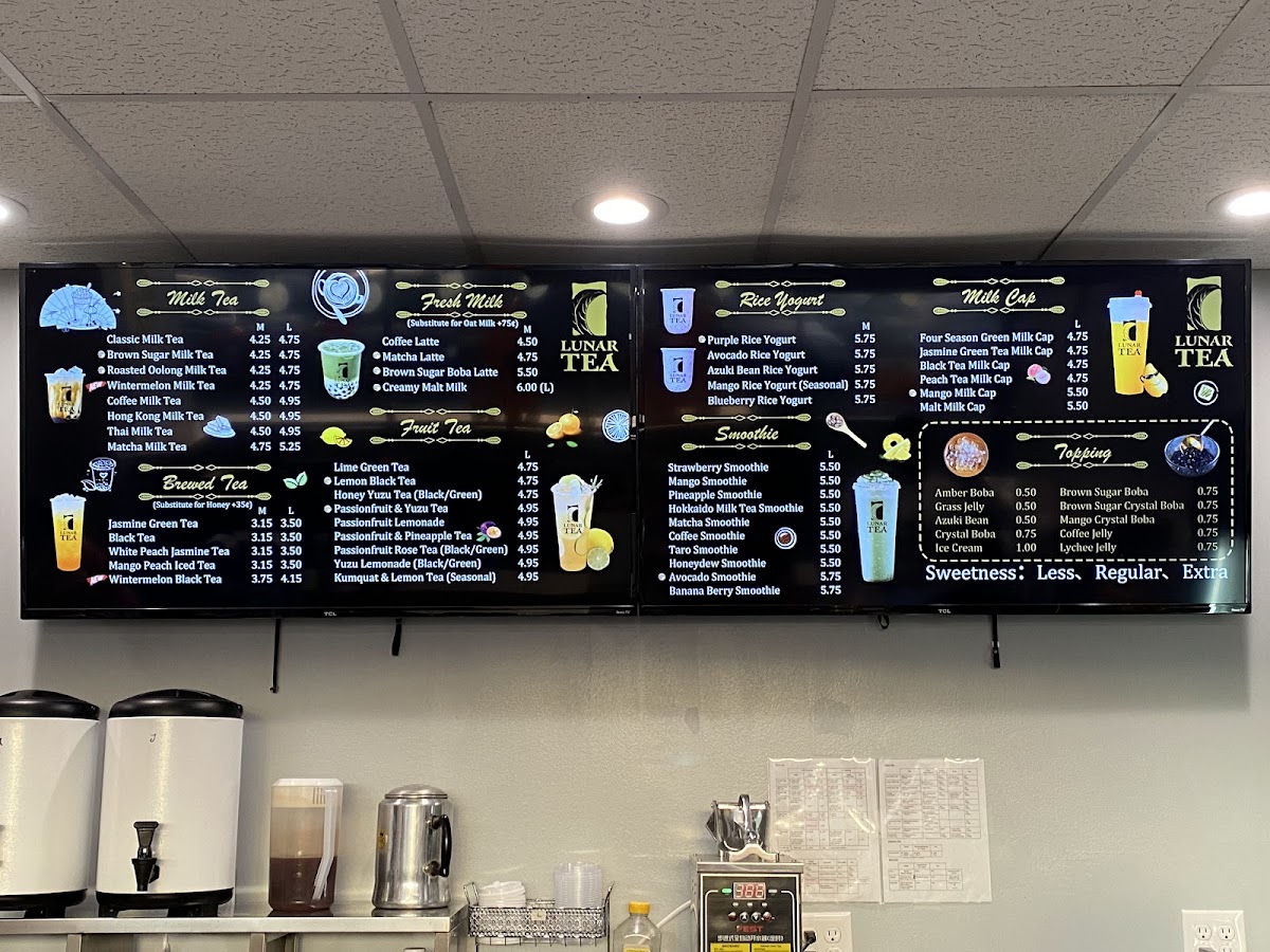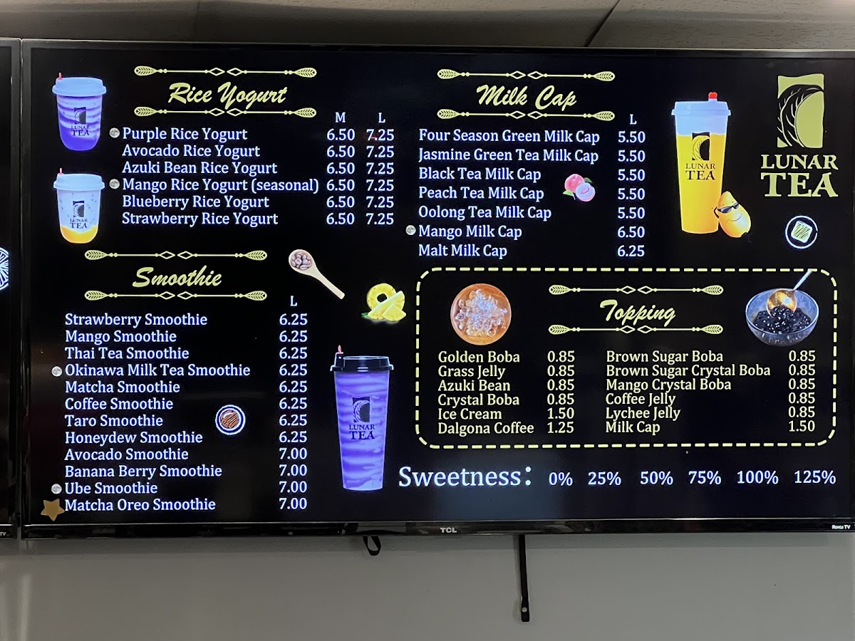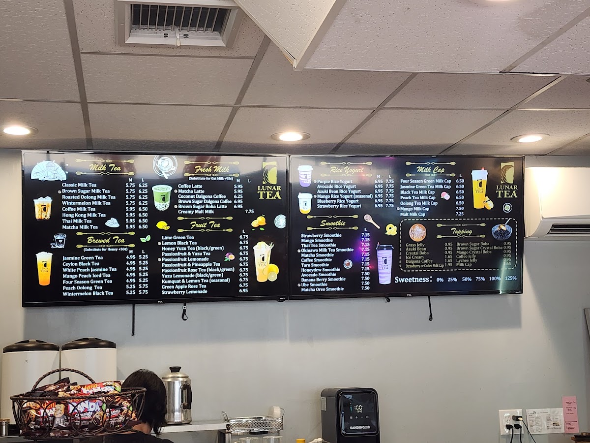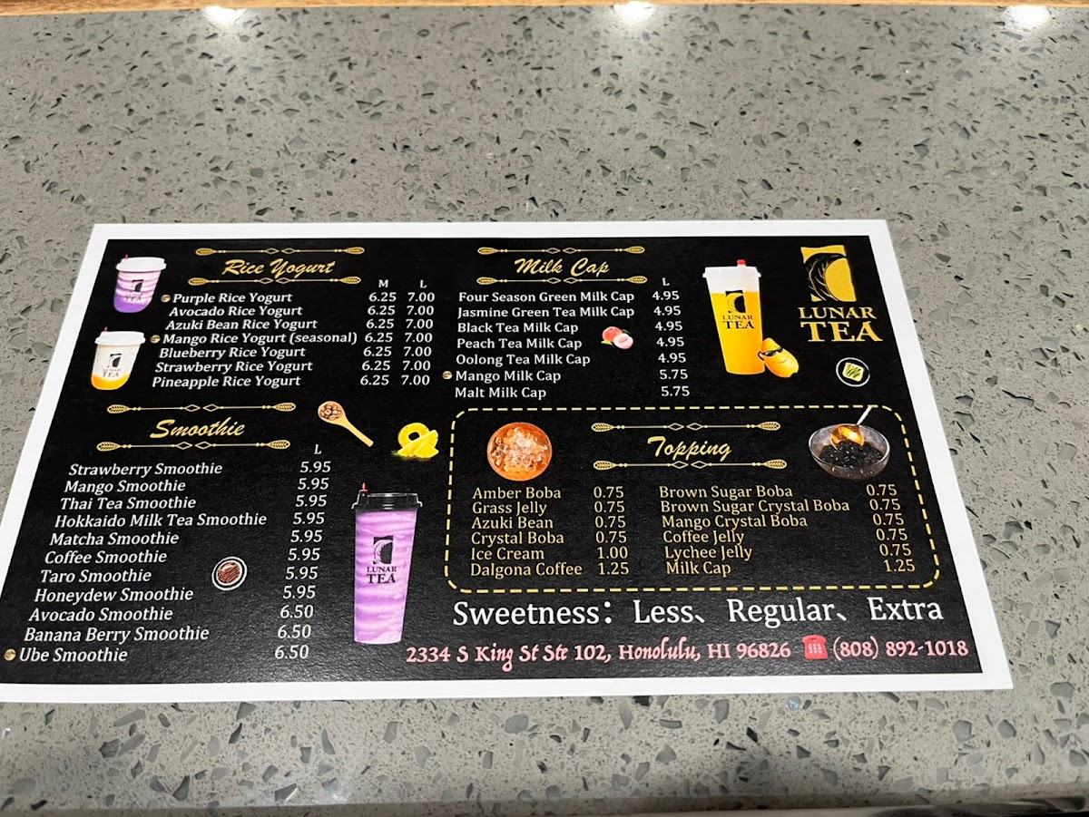From a reviewer’s perspective, Lunar Tea at 2334 S King St Ste 102 delivers a menu that is both vibrant and indulgent, appealing to a wide range of tastes. Their Milk Cap selections, including Mango Milk Cap (Large), Four Season Green Milk Cap (Large), and Black Tea Milk Cap (Large), offer rich, creamy flavors perfect for milk tea enthusiasts. The Smoothie lineup, such as Mango Smoothie (Large), Lychee Smoothie (Large), and Banana Berry Smoothie (Large), brings refreshing fruitiness with a satisfying texture. Snack options like Choco-Filled Pillows, Shrimp Chips, and Lobster Cracker Steak Chips provide a savory counterpoint to the sweet beverages. Lunar Tea’s Fruit Tea offerings, including Lemon Black Tea (Large), Passionfruit & Pineapple Tea (Large), and Li Hing Lemonade, are bright and flavorful, while the Brewed Tea selections like Jasmine Green Tea and Mango Peach Iced Tea deliver a more classic tea experience. For milk tea lovers, choices such as Thai Milk Tea, Wintermelon Milk Tea, and Roasted Oolong Milk Tea are rich and comforting. The Fresh Milk category, featuring drinks like Brown Sugar Dalgona Coffee and Coconut Dalgona Coffee (Medium), emphasizes creamy indulgence with a modern twist. Finally, the Rice Yogurt offerings, including Strawberry Rice Yogurt and Avocado Rice Yogurt, add a unique, healthful dimension to the menu. Overall, Lunar Tea’s menu balances traditional favorites with creative innovations, offering something for every palate.