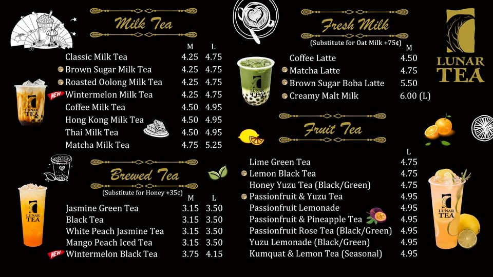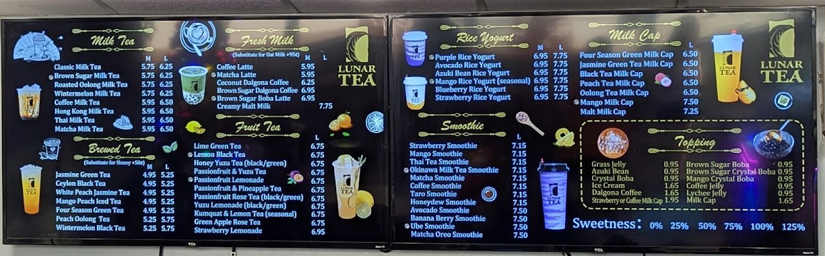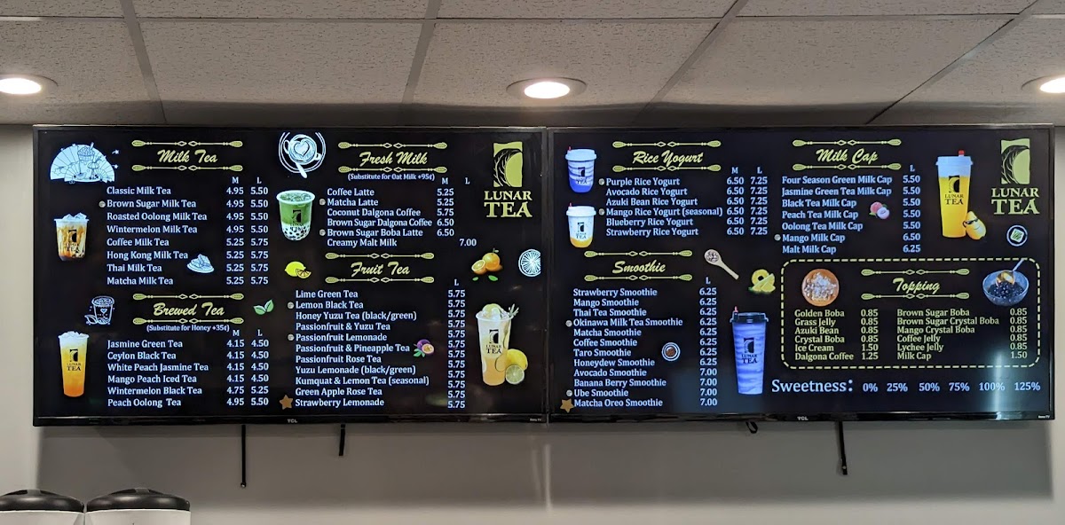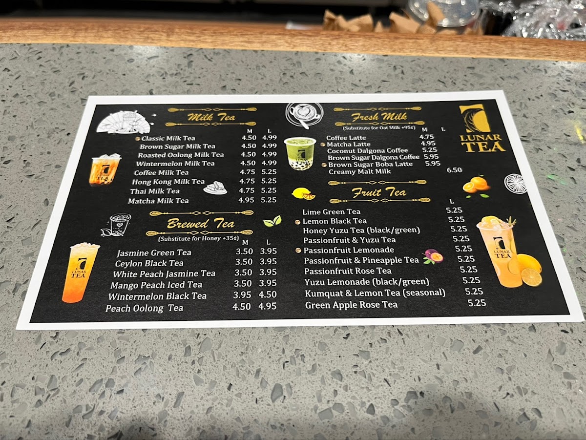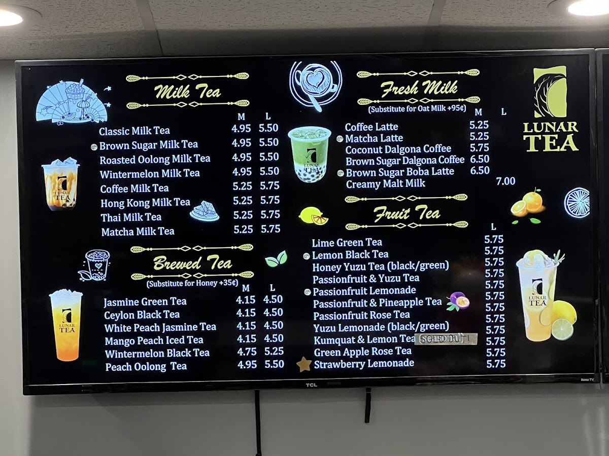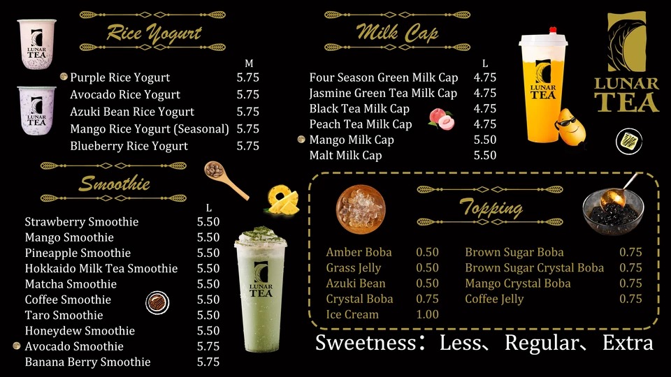 From a reviewer’s perspective, Lunar Tea at 2334 S King St Ste 102 delivers a menu that is both vibrant and indulgent, appealing to a wide range of tastes. Their Milk Cap selections, including Mango Milk Cap (Large), Four Season Green Milk Cap (Large), and Black Tea Milk Cap (Large), offer rich, creamy flavors perfect for milk tea enthusiasts. The Smoothie lineup, such as Mango Smoothie (Large), Lychee Smoothie (Large), and Banana Berry Smoothie (Large), brings refreshing fruitiness with a satisfying texture. Snack options like Choco-Filled Pillows, Shrimp Chips, and Lobster Cracker Steak Chips provide a savory counterpoint to the sweet beverages. Lunar Tea’s Fruit Tea offerings, including Lemon Black Tea (Large), Passionfruit & Pineapple Tea (Large), and Li Hing Lemonade, are bright and flavorful, while the Brewed Tea selections like Jasmine Green Tea and Mango Peach Iced Tea deliver a more classic tea experience. For milk tea lovers, choices such as Thai Milk Tea, Wintermelon Milk Tea, and Roasted Oolong Milk Tea are rich and comforting. The Fresh Milk category, featuring drinks like Brown Sugar Dalgona Coffee and Coconut Dalgona Coffee (Medium), emphasizes creamy indulgence with a modern twist. Finally, the Rice Yogurt offerings, including Strawberry Rice Yogurt and Avocado Rice Yogurt, add a unique, healthful dimension to the menu. Overall, Lunar Tea’s menu balances traditional favorites with creative innovations, offering something for every palate.